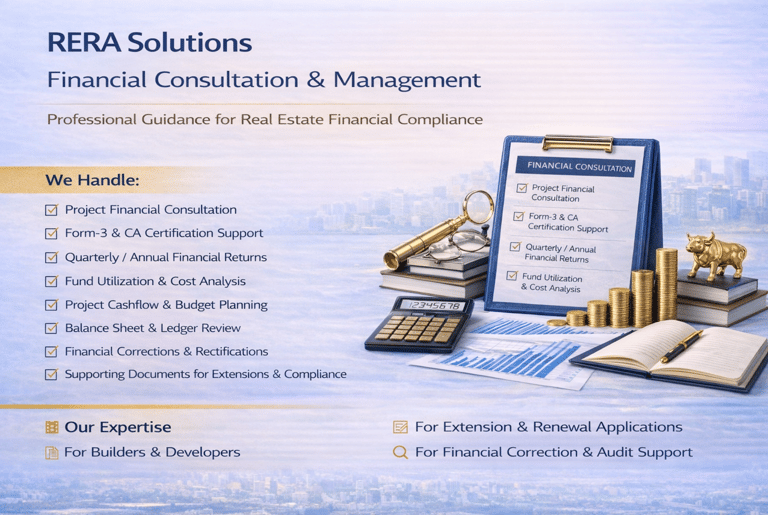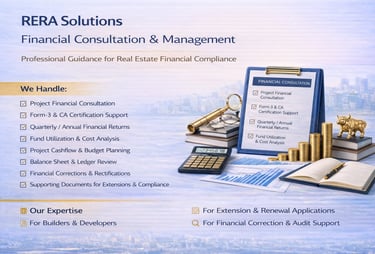 RERA has specific requirements for financial management, particularly regarding the utilization of funds collected from allottees and the operation of escrow accounts. At RERA SOLUTIONS, our financial consultation services are designed to help promoters and developers maintain absolute compliance while optimizing their financial strategies.