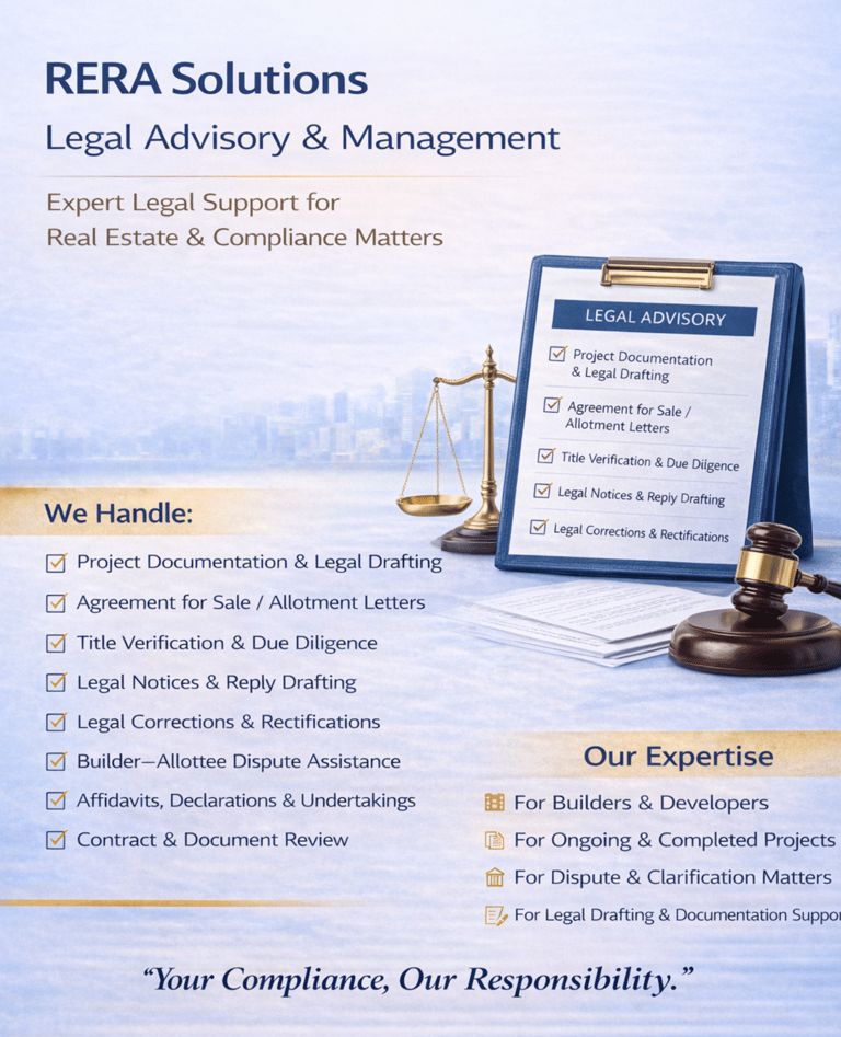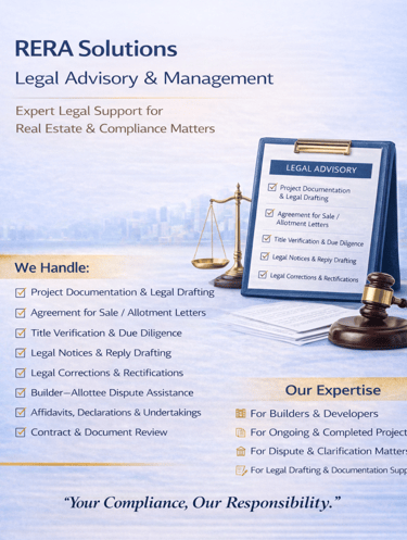 RERA has introduced a new framework for resolving disputes between promoters, agents, and allottees. Navigating this legal landscape requires expertise in both real estate law and RERA-specific regulations. At RERA SOLUTIONS, we provide comprehensive legal advisory and dispute management services to protect your interests and resolve conflicts efficiently.